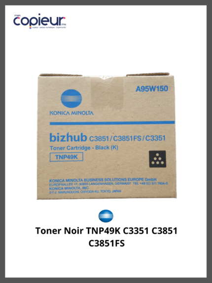 Le Toner Noir TNP49K est un consommable haute performance conçu pour les modèles Konica Minolta bizhub C3351, C3851, et C3851FS, offrant une capacité d’impression de 13 000 pages avec des résultats de qualité supérieure.