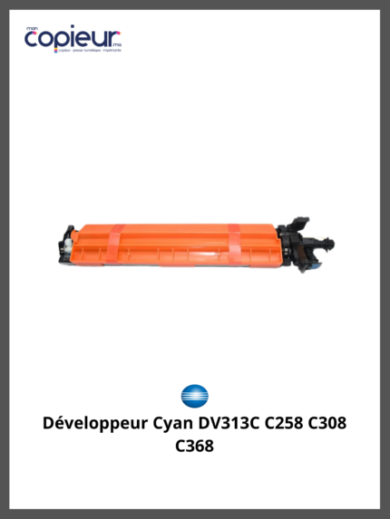 Le Développeur Cyan DV313C est conçu pour les imprimantes Konica Minolta Bizhub C258, C308 et C368. Il offre une capacité de 600 000 pages et assure des impressions de haute qualité avec des couleurs cyan précises.